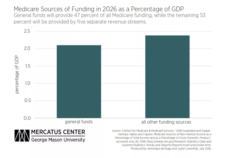 Projections of future revenue and spending from the Centers for Medicare and Medicaid Services predict that in 2026 the trust fund for Medicare Part A—also known as Hospital Insurance (HI)—will be empty. While the trust funds for Medicare Parts B and D will still be solvent by this point, 2.1 percent of GDP (nearly 47 percent of all Medicare funding) will need to be diverted from the federal government’s general funds in order to maintain Medicare’s payments. The remaining 53 percent of Medicare’s funding is provided by five separate sources.