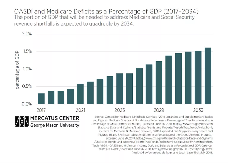 When the Medicare HI trust fund runs out in 2026, combined Social Security and Medicare spending will exceed revenues by 0.87 percent of GDP (or $254 billion, based on the SSA’s projections of future GDP). When Social Security’s trust funds run out in 2034, the combined shortfall of these systems is expected to climb to 1.61 percent of GDP, or $663 billion, based on the same projections.