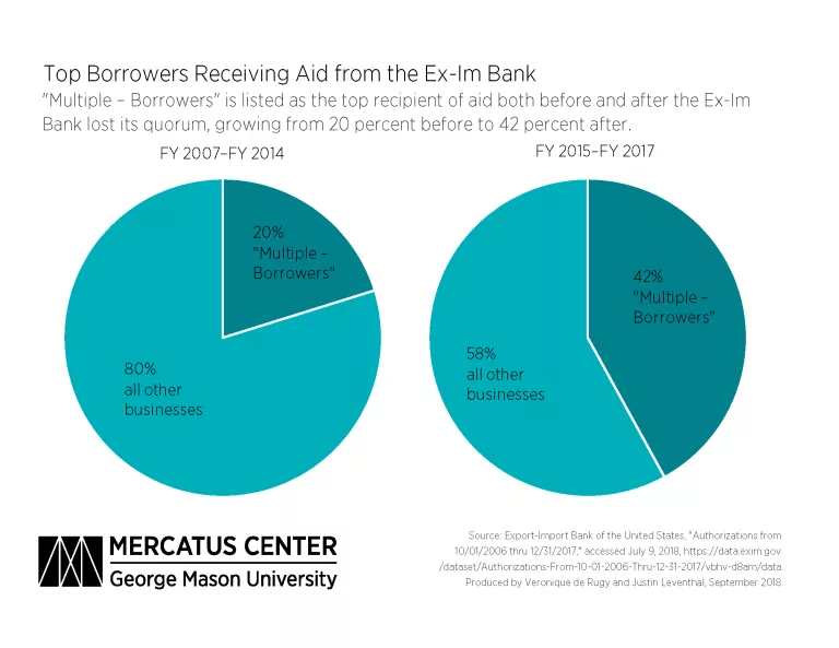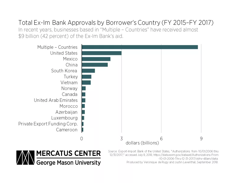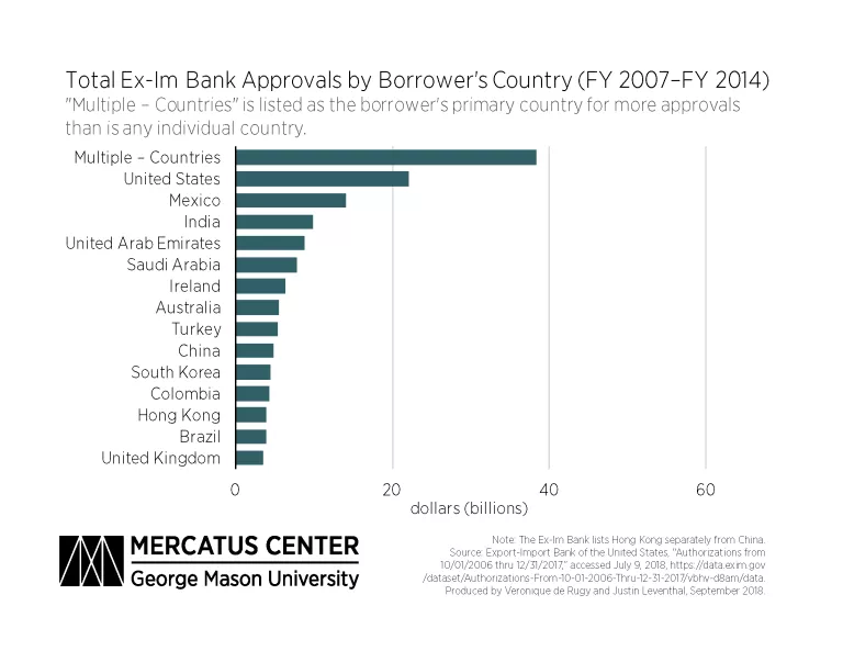 Just as with the borrowers’ and exporters’ identities, borrowers’ countries of origin can be difficult to discern because the largest category is listed simply as “multiple – countries.” Just as with “multiple – borrowers,” this category refers to the Ex-Im Bank’s insurance program serving buyers in multiple countries. From FY 2007 through FY 2017, 22 percent of all Ex-Im Bank approvals went to “multiple – borrowers” in “multiple – countries,” raising concerns about transparency for more than one-fifth of the Ex-Im Bank’s authorizations. This concern is exacerbated by the fact that the second-largest country of origin for borrowers was the United States, despite the stated mission of the Ex-Im Bank to loan money to foreign entities to support US exports. Further, since the Ex-Im Bank lost its quorum in 2015, another one of the 15 top borrowers has been listed simply as a “private export funding corporation.”