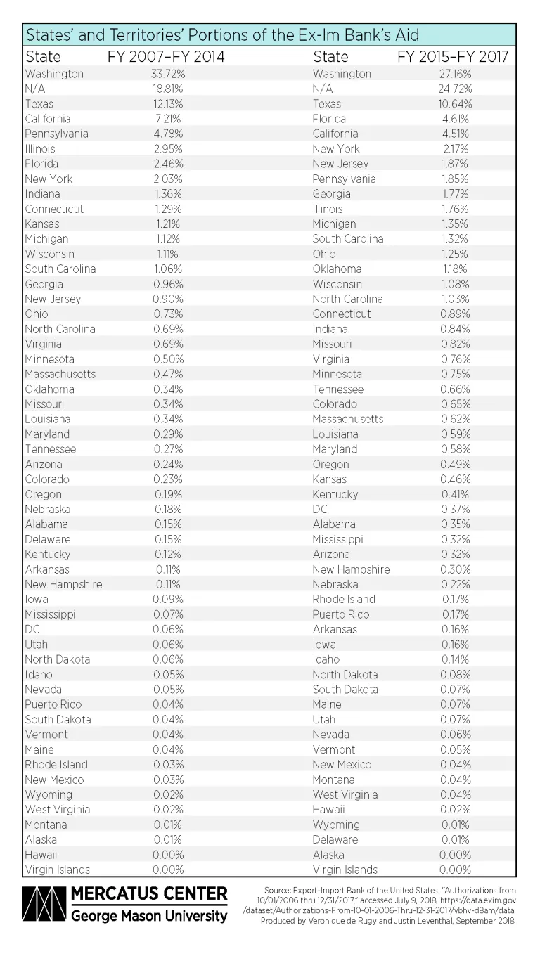 Further transparency issues exist in tracking how much aid each US state and territory’s businesses receive from the Ex-Im Bank. It is unsurprising that the state of Washington receives more total support from the Ex-Im Bank than any other state, given that the Ex-Im Bank’s single largest beneficiary, Boeing, is based there. What is less expected is a lack of transparency as to where in the United States other supported exporters are located. In fact, the state or territory whose exports receive the second-most support from the Ex-Im Bank is listed as “N/A,” at 19 percent when the Ex-Im Bank had a quorum and 25 percent when it did not.