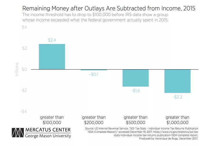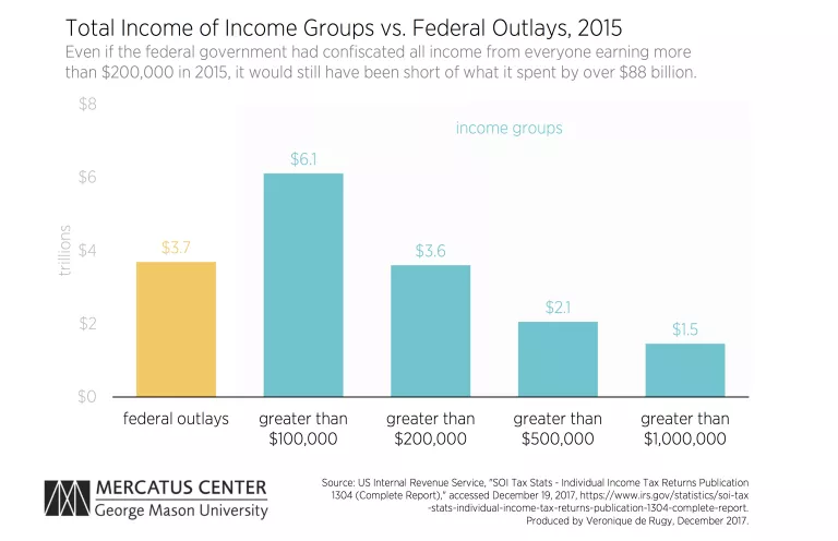 In 2015, the sum of all incomes over $1,000,000 fell short of total federal outlays by more than $2 trillion. As this threshold is lowered, the sum of incomes for all the people above that threshold gets closer to paying for federal outlays. However, even if the federal government had collected all income from everyone earning more than $200,000 in 2015, it would still have been short of what it spent by more than $88 billion. In fact, the threshold has to drop to $100,000 before we see a group whose income exceeded what the federal government actually spent in 2015.
