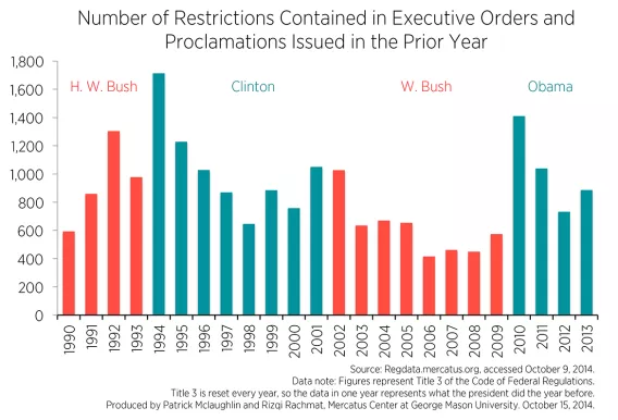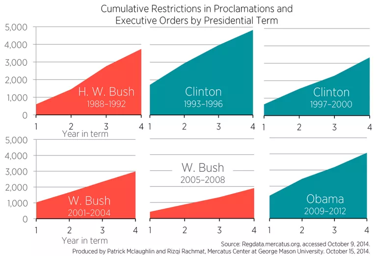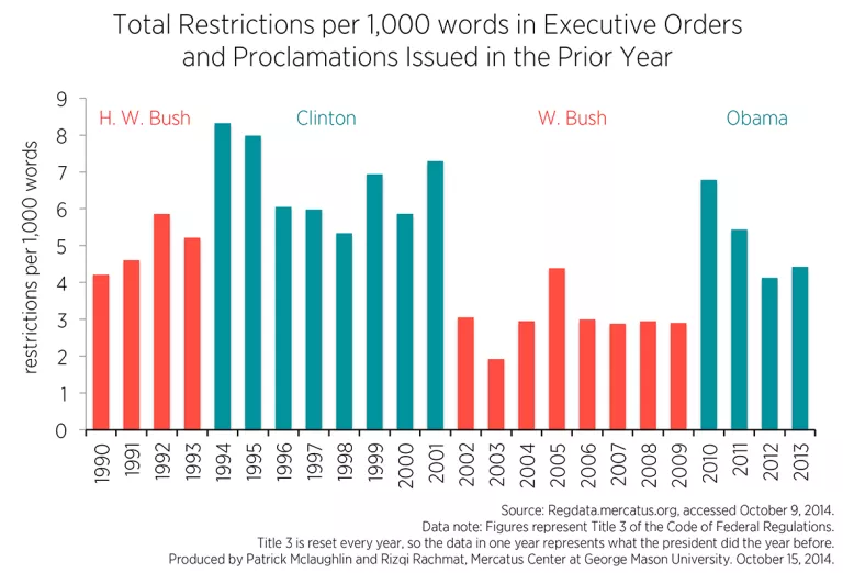 This figure shows a couple noteworthy patterns. First, with the exception of George H. W. Bush, a new president tends to issue the most restrictions in executive orders and proclamations in his first year. It’s plausible that this only occurs after a new president is of a different party than his predecessor, as the incoming president takes actions to repeal the previous president’s policies. This would also explain why George H. W. Bush’s first year did not show a relative surge, since he was taking over from a fellow Republican (for whom he had also served as vice president). Second, while the number of executive orders issued during Obama’s first term may be smaller than many other modern presidents’, the number of restrictions contained in those orders and proclamations appears to exceed the numbers issued by other modern presidents.