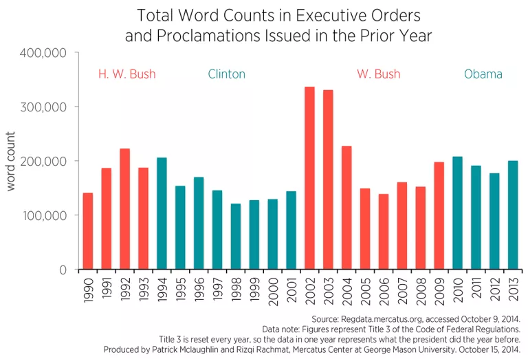 All of the figures above examine only the total number of restrictions issued—an easy variable to examine since RegData measures restrictions by year. In addition to restrictions, RegData also measures the total word count of Title 3 in each year. Word counts paint a different picture compared to restriction counts. An examination of word counts shows similar results as an examination of the number of executive orders published. While George W. Bush issued by far the fewest restrictions in his two terms, he also issued the largest quantity of words (at least in his first term). Similarly, in terms of word counts, the first Obama term and the first Clinton term appear to be typical for modern presidents. Figure 3 shows this.