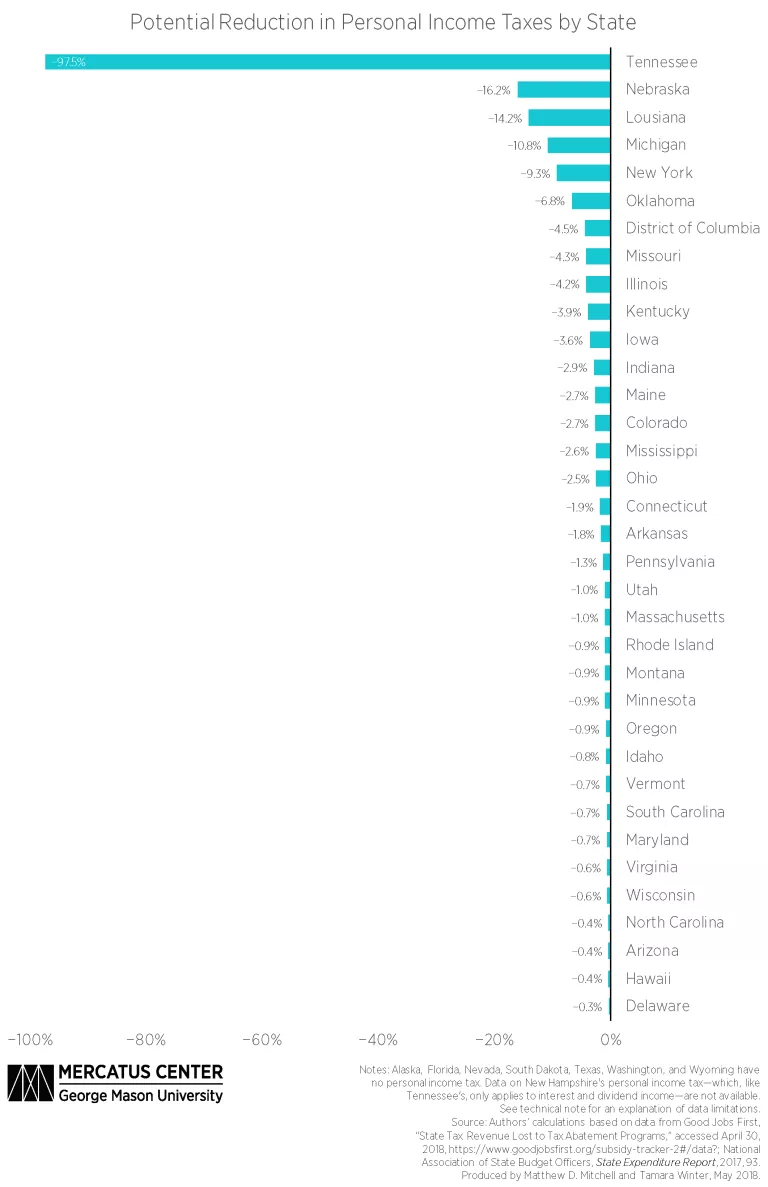- Lawmakers in Louisiana, Michigan, and Nebraska could reduce their states’ personal income tax rates by 14.2, 10.8, and 16.2 percent, respectively, if they eliminated corporate incentives. Tennessee lawmakers could reduce their state’s personal income tax rate by nearly 98 percent if they eliminated all corporate incentives. This is not nearly as dramatic as it seems, however, because Tennessee’s personal income tax only applies to dividend and interest income, so the state’s personal income tax base is quite narrow compared to the tax bases of other states.