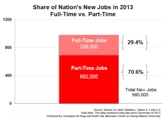 Data Note: The December 2012 jobs data do not reflect adjustments that take into account changes in population. When you compare the share of part-time versus full-time job gains since January 2013 for data adjusted to reflect updated population estimates, new part-time jobs amount to 97.7 percent of total new jobs. Data for part-time jobs can be found in BLS Table A-8, and data for total employment in BLS Table A-1.