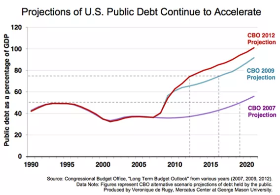 This means that the U.S. is slipping down an unsustainable fiscal path at a much faster rate than before. This unforeseen acceleration in the public debt is important because high levels of debt can have a negative impact on the economy. Economists Carmen Reinhart and Ken Rogoff have shown that when a country’s level of debt reaches 90 percent of GDP, its economy could start shrinking by 1 percentage point every year. The U.S reached this milestone four years ago. One percentage point may not seem like a lot, but as Mercatus Senior Research Fellow Matthew Mitchell has shown, if the U.S. had reached this point in 1975, our standard of living could be 30 percent lower than it is today.