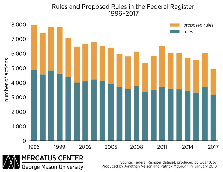 All of these actions—regulatory or deregulatory—are published in the Federal Register. The following figure quantifies the publication of proposed rules and of final rules—two subsets of rulemaking-related actions—in the Federal Register by year for the past 22 years, including 2017.