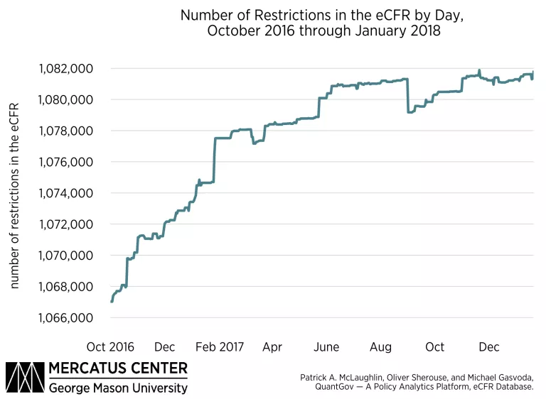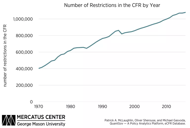 The figure below shows historical data from the RegData 3.0 dataset, which is based on the traditional set of books where regulatory code is published, the CFR. The metric depicted in this figure, regulatory restrictions, is produced by counting select words and phrases, such as shall or must, that are typically used in legal language to create binding obligations or prohibitions. The number of regulatory restrictions on the books at any given point time is an indicator of the total impact of federal regulations on the economy, as well as of the complexity of regulatory code.