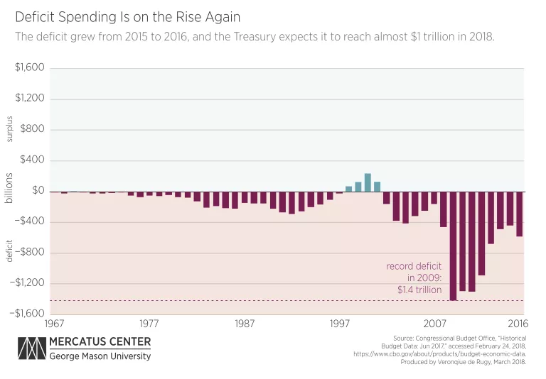 Federal deficits are growing again. The deficit peaked in 2009 to set a new record of $1.4 trillion, a level that was more than three times that of the preceding year. Deficits returned to prerecession levels for only two years, 2014–2015. Since 2015, deficits have been rising again, with the Treasury predicting a deficit of nearly $1 trillion this year.