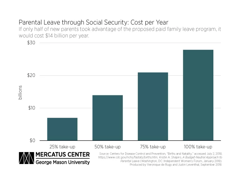 Using the number of births in 2016 as a baseline, one can estimate the future cost of parental leave payments each year, depending on the percentage of new parents who take advantage of their new entitlement. If only half of all new parents collected family leave payments from this system, the cost would be $14 billion per year.