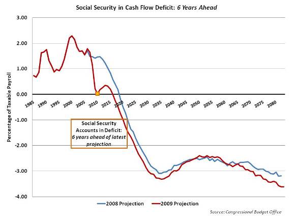 While part of the acceleration in the onset of Social Security deficits is due to the impact of the recession on taxation, by all projections, the unsustainable deficits in Social Security will continue into the future.