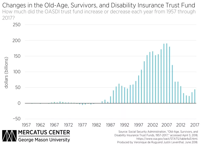 Old-Age, Survivors, and Disability Insurance (OASDI), more commonly referred to as Social Security, is a program intended to provide assistance to retirees and disabled individuals. It was initially intended to be paid for via a payroll tax, but the portion of Social Security’s funding coming from this source has decreased. In 1957, 93 percent of all OASDI revenue came from the payroll tax, yet by 2017 this had fallen to 88 percent. The remainder is collected in the form of taxed benefits, reimbursements from the general fund, and interest on investments.