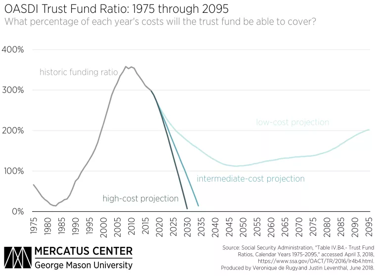 In two of the Social Security Administration’s (SSA) three projected scenarios, however, Social Security will start paying out more money than it takes in. The SSA’s different projections are based on low-, intermediate-, and high-cost assumptions about the program. In both the intermediate- and high-cost scenarios, SSA projects that benefits will be larger than revenue to the point of draining the trust fund entirely. Under the intermediate-cost scenario, the fund will reach zero in 2034, and in the high-cost scenario in 2030. The low-cost scenario is the only one in which SSA predicts the trust fund to be sustainable. Many don’t realize that if the trust fund runs out of money, benefit payments will either be reduced to an estimated 79 percent of current levels, or Congress will need to appropriate additional funds by raising taxes, borrowing more money each year, or both.