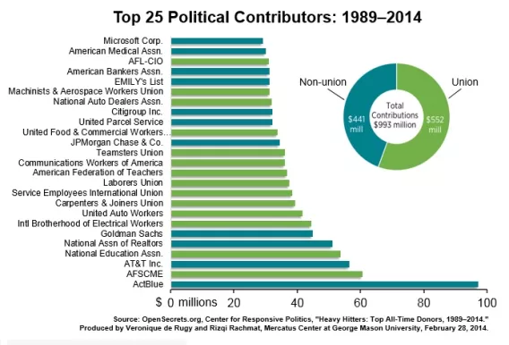 - Public and private sector unions contributed 55.6 percent, or $552 million, of all campaign contributions.