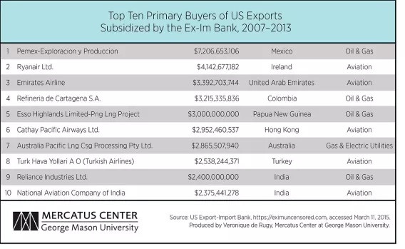 Using a dataset that the US Export-Import Bank recently made available to the public, one can see which foreign companies are among the top purchasers of American exports financed by the bank’s subsidy programs. The following table shows the top 10 foreign buyers, based on the total amount of financing authorized from fiscal years 2007 through 2013.