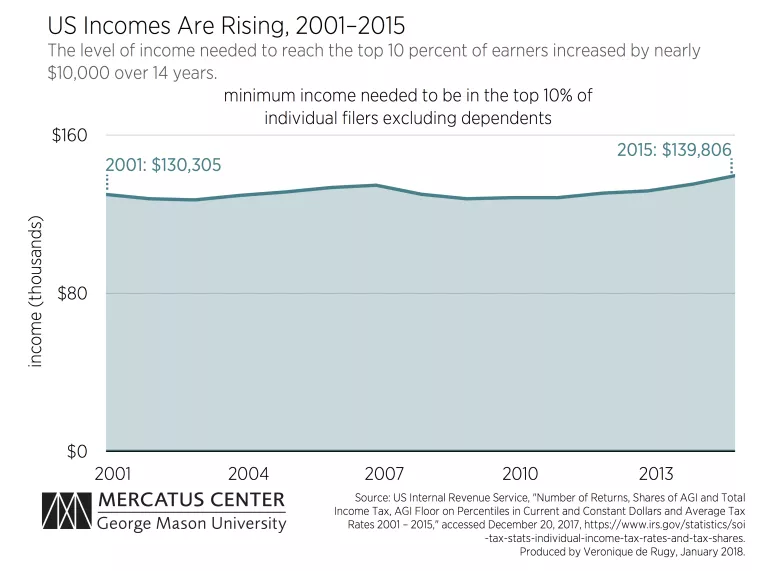 According to the IRS, for individual tax filers in 2001 who didn’t list any dependents, an income of more than $130,305 was sufficient to be among the top 10 percent. By 2015 this threshold had risen to $139,806, a nearly $10,000 increase.