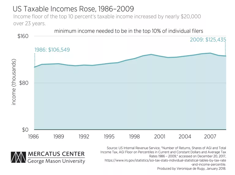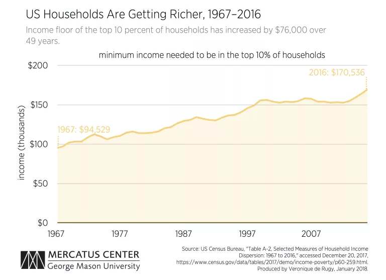 When people talk about “the rich,” they might often think of millionaires and billionaires, but this thinking would not be completely accurate. People may assume that being in the top 10 percent makes you incredibly rich—and at one time this may have been the case—but incomes in the United States are rising (even after controlling for inflation). If one considers “the rich” to be those within the top 10 percent of income earners, then an overall increase in incomes would cause the level of income required to be one of “rich” to rise as well. Data provided by the IRS and Census confirms this.