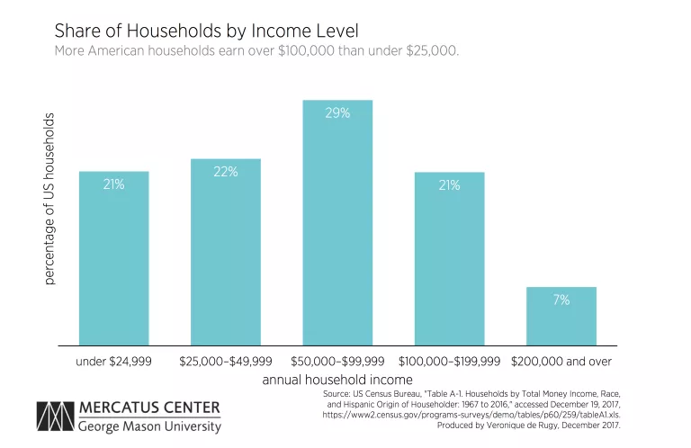 According to the US Census, 7 percent of households earn over $200,000 annually, 14 percent earn over $150,000, and 28 percent earn over $100,000. It is interesting that, for each additional $50,000 earned, the proportion of Americans earning that much or more drops by half.
