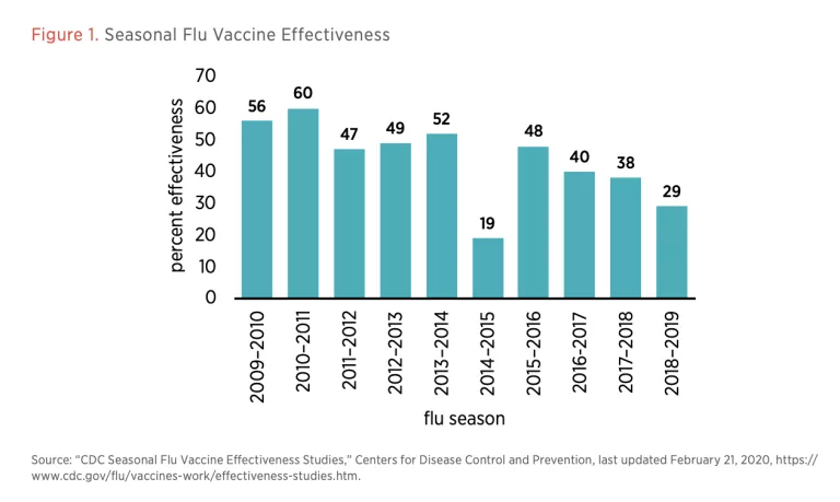 Safety and effectiveness of vaccines should be thoroughly studied, but in this extreme situation all should recognize that safety and effectiveness are not all-or-nothing properties. A vaccine that is available this summer that is probably (but not guaranteed to be) safe could be better than no vaccine going into a second wave of the pandemic this fall. And effectiveness even for approved vaccines is known to be incomplete and variable. According to the Centers for Disease Control and Prevention, the flu vaccine for the 2018–2019 flu season was only 29 percent effective (see figure 1). That said, even a partially effective vaccine improves herd immunity and drives the effective reproduction rate of the virus down so that outbreaks are easier to contain. The seasonal flu is a challenging target, and there is every reason to expect that a coronavirus vaccine could have higher effectiveness, but even partial effectiveness creates significant value.