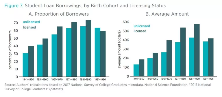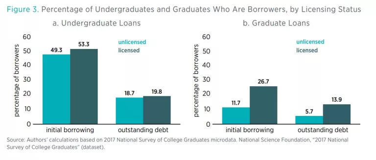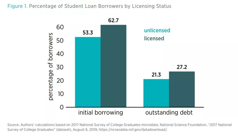 - Licensed workers are almost 10 percentage points more likely to have borrowed for their college education and almost 6 percentage points more likely to have outstanding student loan debt than unlicensed workers.