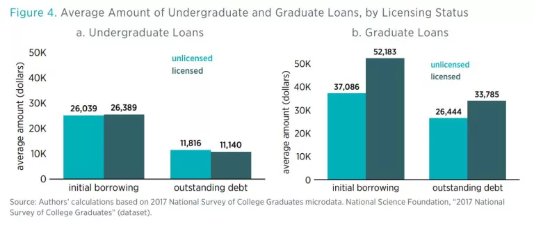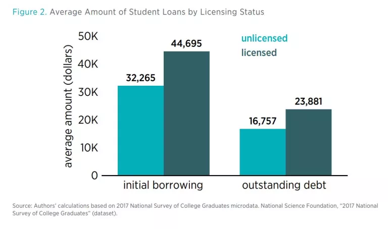 - Among student loan borrowers, licensed graduates borrow about $12,000 (or 38.5 percent) more and have student loan debt balances about $7,000 (or 42.5 percent) more than unlicensed graduates.