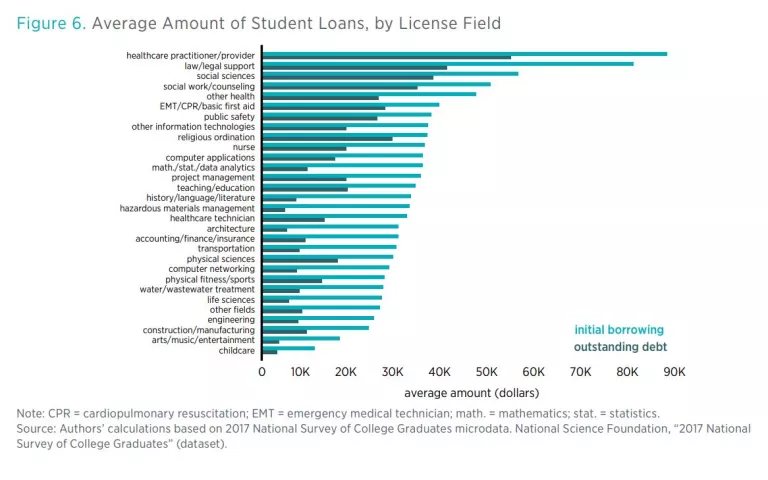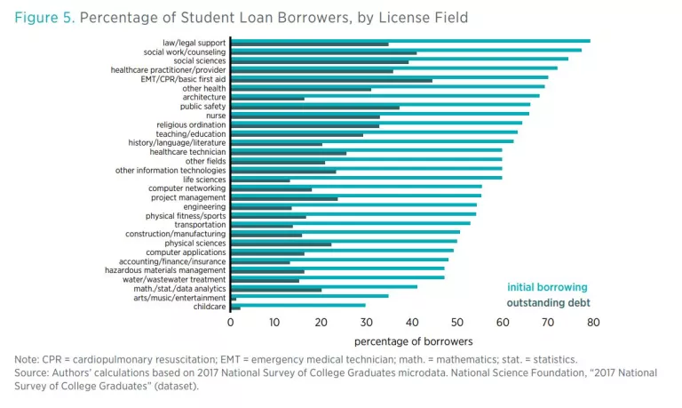 - The differences in student loan borrowing and outstanding debt between licensed and unlicensed graduates are mostly attributable to licensed individuals who have obtained postgraduate education, such as healthcare practitioners and lawyers.