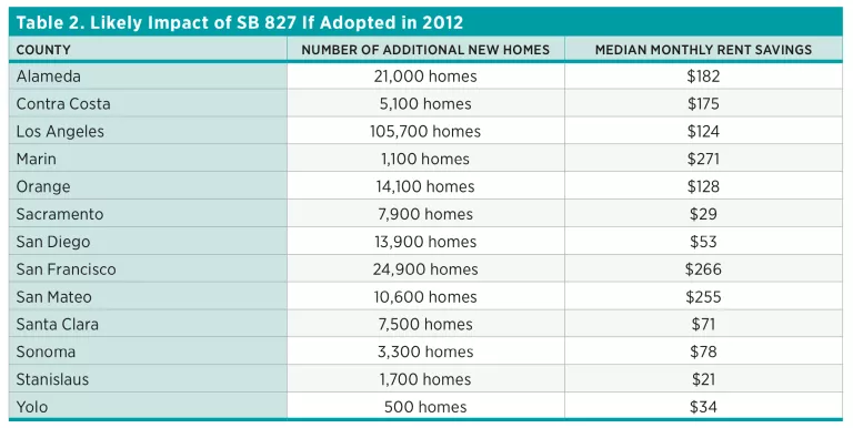 A dearth of new homes and expanding housing demand cause high inflation in the housing market. Even though Denver, Austin, and Seattle had higher demand growth than any California metro, rent in those cities grew less rapidly. Had California implemented measures to accommodate growing demand as the rest of the country does, its residents would now be paying less in rent. This article considers a counterfactual thought experiment: how would California’s housing market be different today if a policy currently under consideration in the California Senate—SB 827, which would allow new residential building along public transit corridors—had been implemented six years ago? I estimate that rent would be 5.8 percent lower in San Francisco, a savings of $266 per month on the median home, and 4.2 percent lower in Los Angeles County, savings of $124 per month.