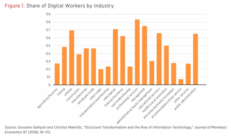 Our estimates are based on recently released data on real GDP (at 2012 prices) between 2000 and 2018 from the Bureau of Economic Analysis. Rather than classifying certain industries as “directly affected” by COVID-19, we use the digital-labor intensity of each industry to quantify the varying effect across industries. That intensity level is the share of digital workers within each industry derived from information on tasks at an occupational level from the Department of Labor’s O*NET database (see figure 1).