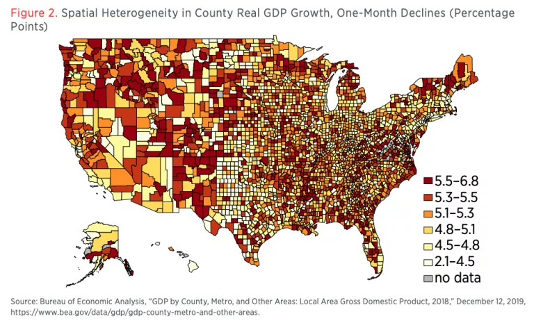 For a visual county-to-county comparison, we offer a heat map that shows our estimate of penalties on growth for each county (figure 2).