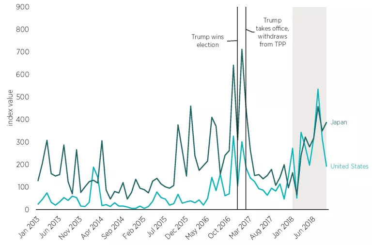 Note: TPP = Trans Pacific Partnership. The shaded period represents when President Trump announced tariff hikes; and when trade policy tensions intensified, especially between the United States and China.