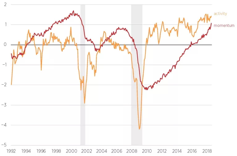 Sources: Federal Reserve Bank of St. Louis, “KC Fed Labor Market Conditions Index, Momentum Indicator,” accessed November 4, https://fred.stlouisfed.org/series/FRBKCLMCIM; Federal Reserve Bank of St. Louis, “KC Fed Labor Market Conditions Index, Level of Activity Indicator,” accessed November 4, https://fred.stlouisfed.org/series/FRBKCLMCILA.