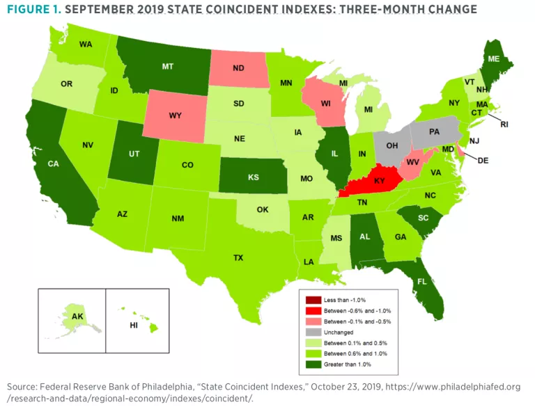 A quick glance at the map identifies the states that are hurting most from the trade-war-induced slowdown: Delaware, Kentucky, North Dakota, Ohio, Pennsylvania, West Virginia, Wisconsin, and Wyoming. All these states specialize in manufacturing, coal, grain, or some combination thereof.