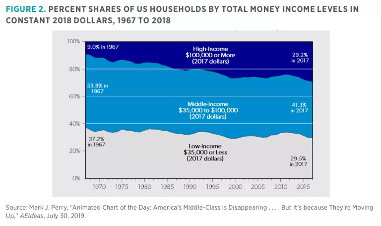 These results are shown in figure 2, developed by American Enterprise Institute economist Mark Perry. Notice that in 1967, just 9.7 percent of US families were included in the high-income group. In 2018, 30.4 percent were high-income households. And in 1967, 53.8 percent of all households were counted in the middle-income group. In 2018, the middle-income share included 41.7 percent of all households. Finally, take a look at the low-income category. The share fell from 30.4 percent to 27.9 percent.