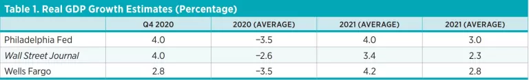 So, what are national forecasters saying for the year ahead and beyond? In table 1, I provide real GDP growth forecasts from the Wall Street Journal panel of economists, from the Federal Reserve Bank of Philadelphia, and from Wells Fargo. These are for the fourth quarter of 2020 and for the years 2020, 2021, and 2022. Keep in mind that, to my knowledge, none of these forecasts explicitly takes account of the timing for the distribution of a virus vaccine or the probability of another extensive economic shutdown that would sharply affect GDP growth. I take the numbers for what they are, the best estimates the various parties could make given their current knowledge.