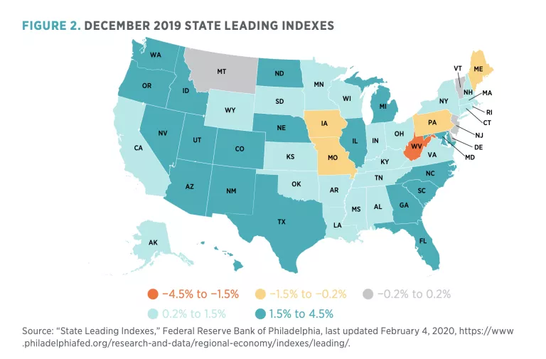 Still acknowledging that the coronavirus’s effects are not yet registered in the data, my expectations are more generally strengthened by the monthly charts from the Federal Reserve Bank of Philadelphia showing (in figure 1) the current situation and (in figure 2) leading indicators for personal income growth across the 50 states. The leading indicators predict outcomes six months out. Here, I report December 2019’s charts. When comparing the two charts, notice the number of states in figure 1 with greater than 1.0 percent growth and how in figure 2 the number of states with 1.5 to 4.5 percent growth is greater. These charts provide a comparison between December 2019 and June 2020, a snapshot for the first half of the year.
