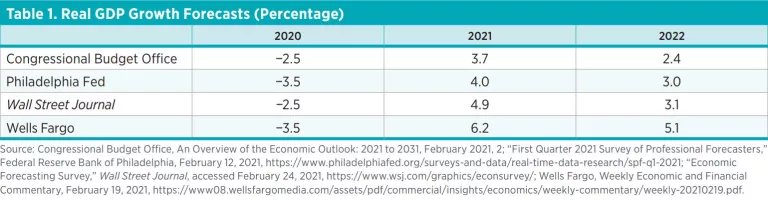 A review of what various forecasters expect for 2021 and 2022 gives reason for optimism. (I note to readers that the first estimate for 2020 real GDP growth came in at −3.5 percent. The Federal Reserve Bank of Philadelphia and Wells Fargo should pop a cork!) As shown in table 1, 2021 is expected to see greater than 4.0 percent real GDP growth, and 2022 will show weaker growth. I call attention to the extraordinary Wells Fargo forecast. It is the only one that explicitly takes account of the $1.9 trillion stimulus bill making its way through Congress when the forecast was made. Otherwise, the rise and decline are associated with the combined effects of stimulus growth and tax increases promised by the Biden administration.