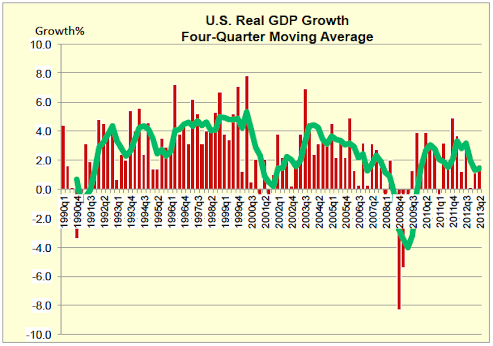 If so, you understand the relief that comes when finally you see service station markers ahead. Believe it or not, there is some relief in sight for our economy . . . maybe. We see the latest GDP growth data in the following chart. The four-quarter moving average points toward 2.0 percent, and there is general agreement that we are headed in that direction. And here’s the better news: there are good signs that the third lane will open in 2014, that the economy will again chug along with 3.0 percent real GDP growth.