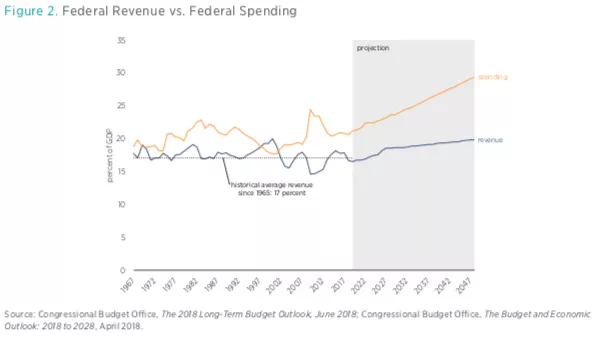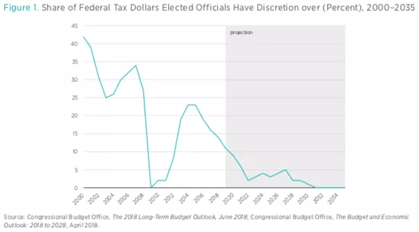 According to 2018 projections by the Congressional Budget Office (CBO), by 2031 all revenues collected by the federal government will be precommitted before Congress even begins to debate the budget. This precommitted budget will cover just four areas of mandatory spending—Medicare, Medicaid, Social Security, and net interest. Eighteen years ago congress had discretion over more than 40 percent of government revenues, today that figure is around 14 percent, and by 2031 Congress will officially have no say on how Americans’ tax dollars are spent—policymaking as we know it will become futile.