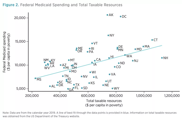 To assess whether the distribution of federal Medicaid dollars is related to state fiscal capacity, I begin by exploring the correlation between federal Medicaid assistance and total taxable resources (TTR) per person in poverty. TTR is a comprehensive measure of taxable income, including wages, dividends, capital gains, pensions, and corporate profits; it is compiled annually by the US Department of the Treasury. Importantly, TTR is unrelated to a state’s current tax regime; it captures all state income, regardless of whether the state imposes taxes on that income. Thus, TTR serves as an objective measure of the ability of a state to generate its own resources and finance its own social safety net without needing to appeal to the federal government.