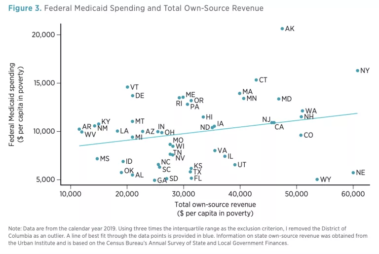 Although a useful measure of fiscal capacity, TTR admittedly does not reflect actual resources at the disposal of state policymakers. Jurisdictions across the country vary widely in their tax structures and rates; these variations have a substantial effect on state revenues. An alternative approach is to compare federal Medicaid assistance to states’ current own-source revenues (including taxes, fines, fees, and other levies) per person in poverty. This approach (depicted in figure 3) yields similar results. Albeit weaker than that seen in figure 2, a positive association is still found: states with higher revenues tend to receive higher levels of federal Medicaid assistance.