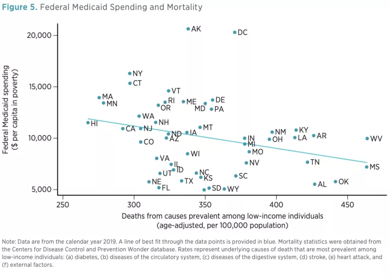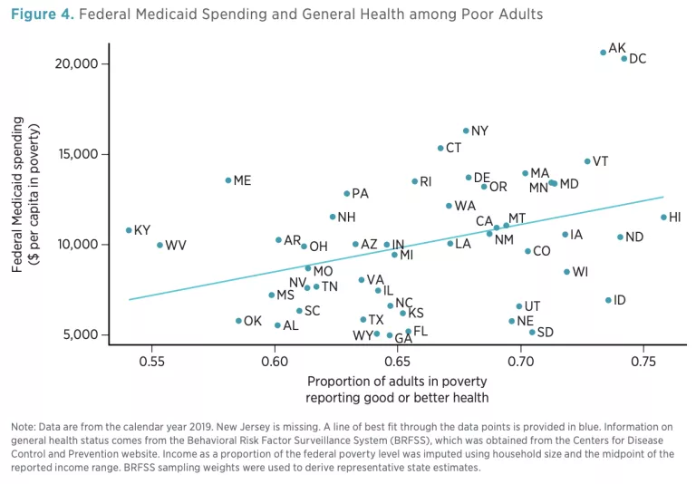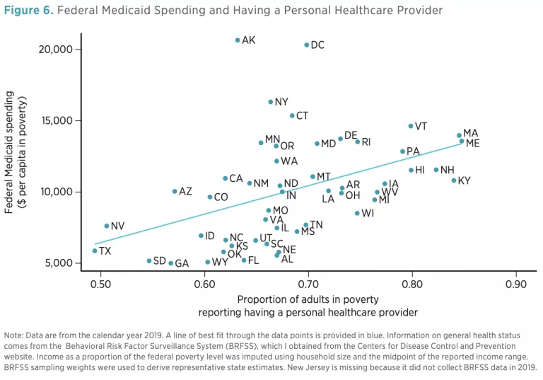 Simple bivariate relationships can sometimes be misleading, particularly when omitted factors exert influence over the measures being plotted. The comparisons in this brief necessarily ignore a great deal of nuance, including state variation in Medicaid eligibility rules and optional services covered by Medicaid. It is my hope that the preliminary evidence presented here will stimulate further, more rigorous inquiry.
