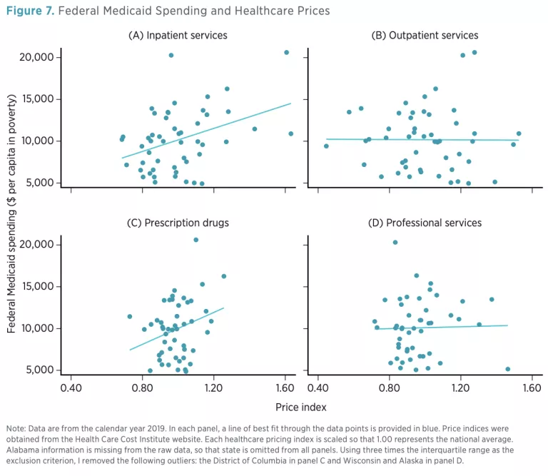 Prices for inpatient services (panel A) and prescription drugs (panel C) are positively correlated with the level of federal Medicaid assistance. In both cases, however, the data points take the shape of a cloud and are poorly modeled by a linear relationship. Moreover, average spending on inpatient services and prescription drugs accounts for less than 39 percent of total healthcare spending, according to HCCI’s estimates. Overall, higher healthcare prices are only weakly associated with enhanced federal Medicaid funding.