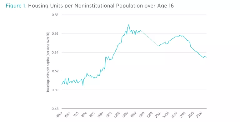 In terms of stock, the Census Bureau maintains estimates of both US population and the number of housing units. As shown in figure 1, the ratio of homes to adults in the United States rose in the 1980s as a result of factors such as changing marriage norms. The ratio then declined in the 1990s. The relative number of housing units increased somewhat from 2000 to 2005 but remained below the previous peak level. After the crisis, the decline continued.