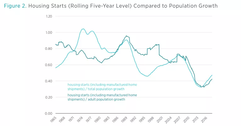 In terms of flow, the Census Bureau measures the construction of several forms of housing. Figure 2 shows the rolling five-year level of new housing starts (including manufactured homes, homes in multi-unit properties, and single-family homes) compared to total population growth (light blue line) and compared to adult population growth (dark blue line). The rate of housing starts was not unusual by either measure during the 2000–2010 period, and has since moved well below long-term norms.