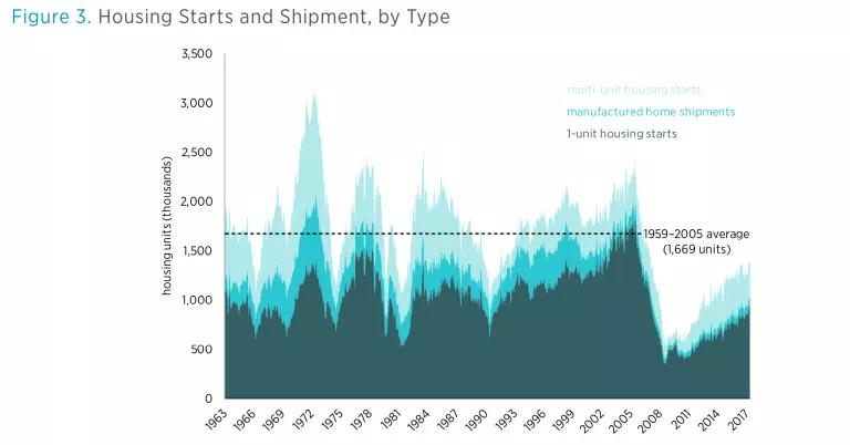 Figure 3 stacks the numbers of new housing units started or shipped over time. Single-family homes, at the bottom, make up the bulk of new housing units. Manufactured homes and multi-unit homes, which make up a relatively small portion of new housing units, stack on top. The horizontal dashed line shows the average number of new units built annually from 1959 to 2005—just before the crisis.