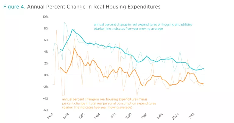 Another way to measure the growth in the housing stock is to measure real expenditures on housing over time. Figure 4 shows the long-term annual growth in real housing expenditures (dark blue line). Housing consumption has been increasing more and more slowly over time. The dark orange line measures the growth in real housing expenditures minus the growth in total real spending. This raises the question, Was real consumption of housing growing more quickly than real consumption in general? As real income increases, is housing a larger portion of the new basket of goods and services or a smaller portion than it had been before?