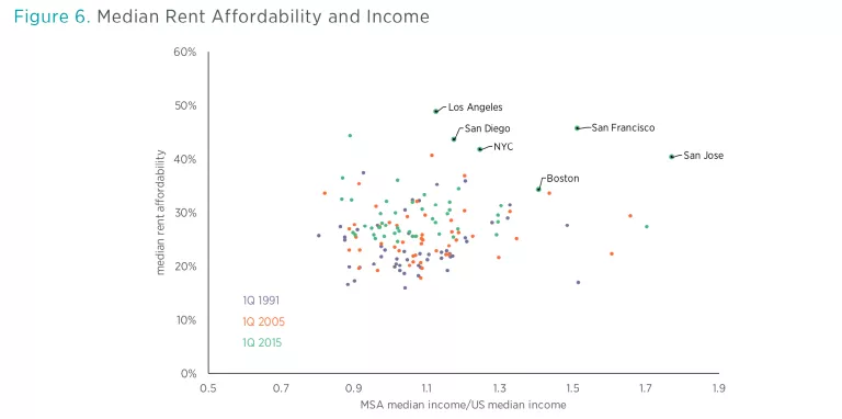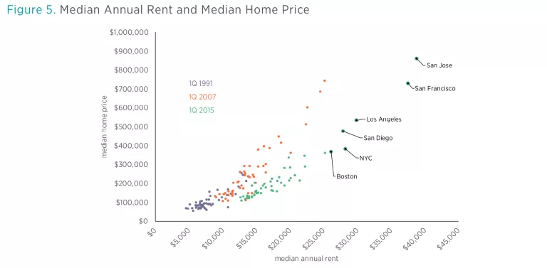 Yet few places fit that description. For the most part, there were places where housing starts were low, while rents and prices were both rising, and there were places where housing starts were healthy, while rent and price increases were moderate. If we compare median annual rent and median home price within each metropolitan area, it is clear that rents were an increasingly important determinant over the past two decades of home price differentials between different metropolitan areas. And as shown in figure 5, in this regard, the Closed Access cities have become outliers—much higher rents leading to much higher prices.