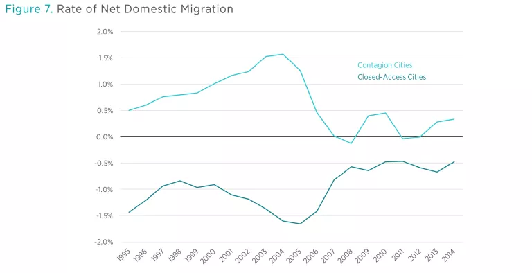 Figure 7 compares net domestic migration of Closed Access cities and Contagion cities. Notice that high rates of out-migration from Closed Access cities correspond to periods of large in-migration to the Contagion cities. Credit markets may have facilitated some of the housing activity during the housing bubble, but at its core this was a mass migration event caused by a lack of housing.
