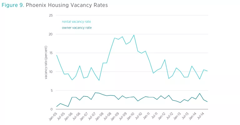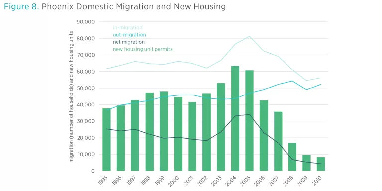 By 2006, Phoenix had a growing number of empty homes and a large inventory of homes for sale. But from 2005 to 2008, the number of new homes approved in Phoenix dropped faster than net migration was dropping. Housing supply had reacted remarkably quickly to shifting demand. Even as housing starts were collapsing, rents were rising, as they were in most cities at the time.
