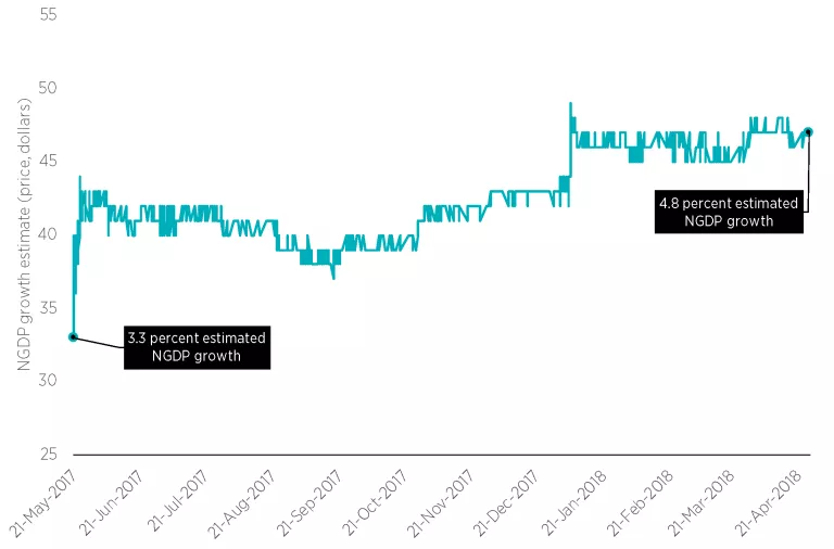 Figure 1 shows the price of Hypermind NGDP contracts for 2017:Q1 to 2018:Q1: